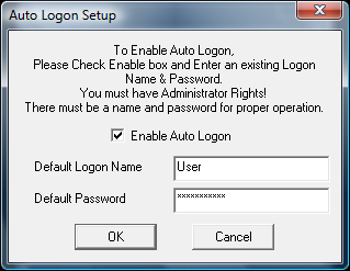 Check Enable Auto Logon On to enable the automatic logon of the Default User / Default Password combination. You must enter a valid User Name along with the proper Password to ensure proper operation of the Automatic Logon.