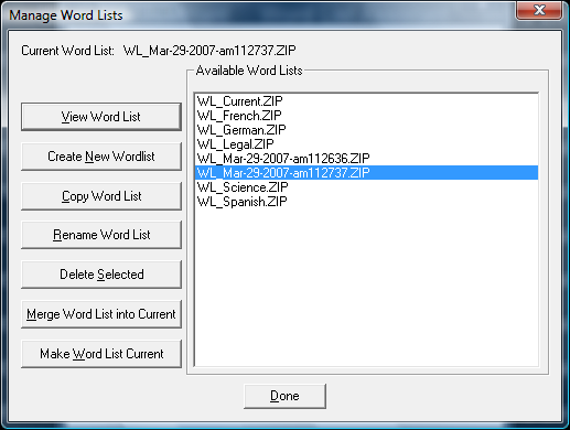 You can copy an existing word list to a different word list. Simply enter the new name (the WL_ prefix and .ZIP extension will be automatically entered).